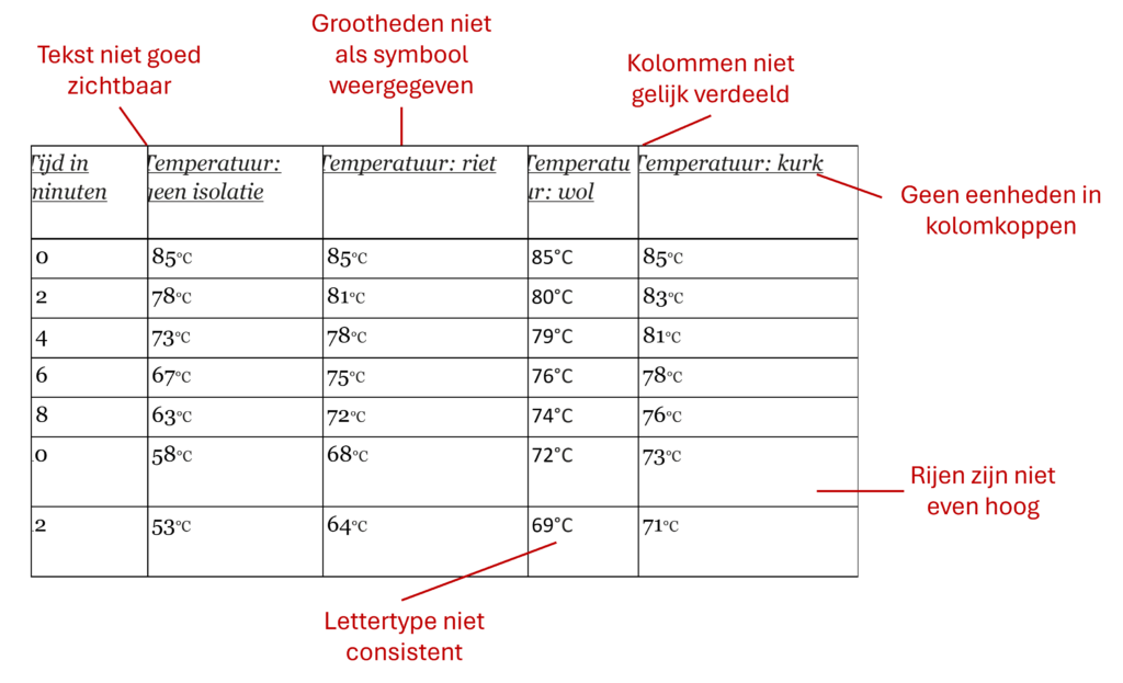 Juiste en onjuiste weergave tabel